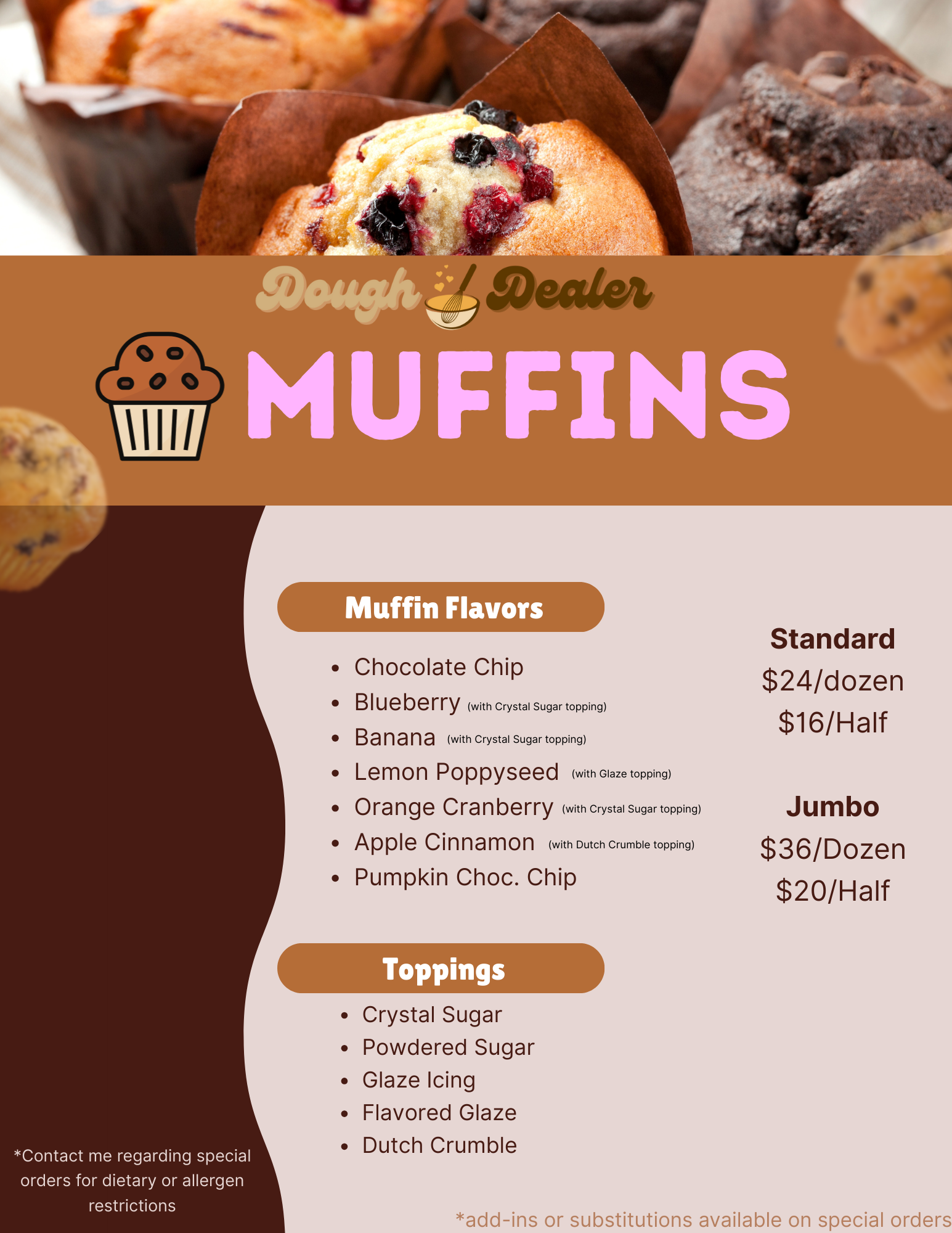 Classic chocolate chip muffins loaded with premium chocolate chips and baked to perfection. These beloved treats offer a tender crumb with bursts of chocolate in every bite, perfect for breakfast or an afternoon snack.
