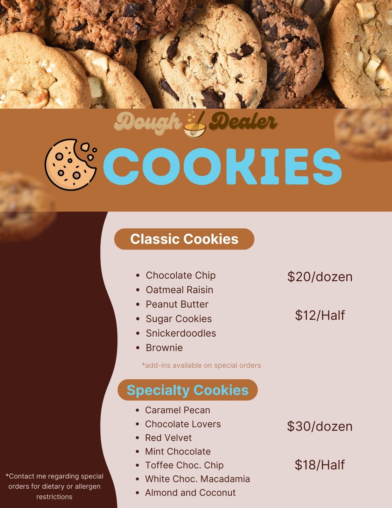 Our signature chocolate chip cookies are made with premium chocolate chips and baked to golden perfection. These classic treats feature a perfect balance of crispy edges and chewy centers, making them irresistible for cookie lovers of all ages.